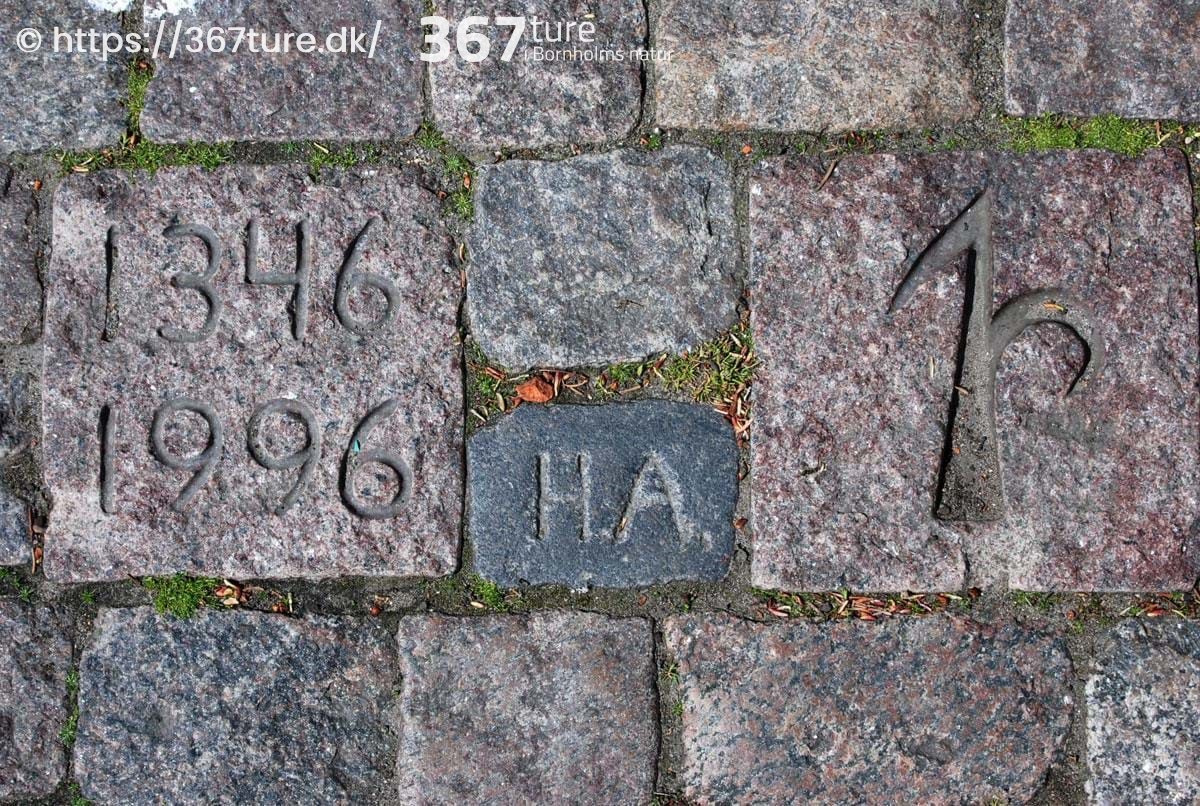 Find brostenen, hvori Martins far - Hans Andersen - har hugget sine initialer. Som formand for sjakket, der udførte den første brolægning af torvet, signerede han arbejdet.