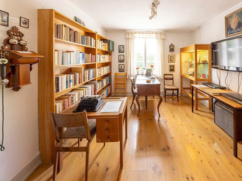 I udstillingen i "vaskehuset" i gården vises en film om forfatterens liv.